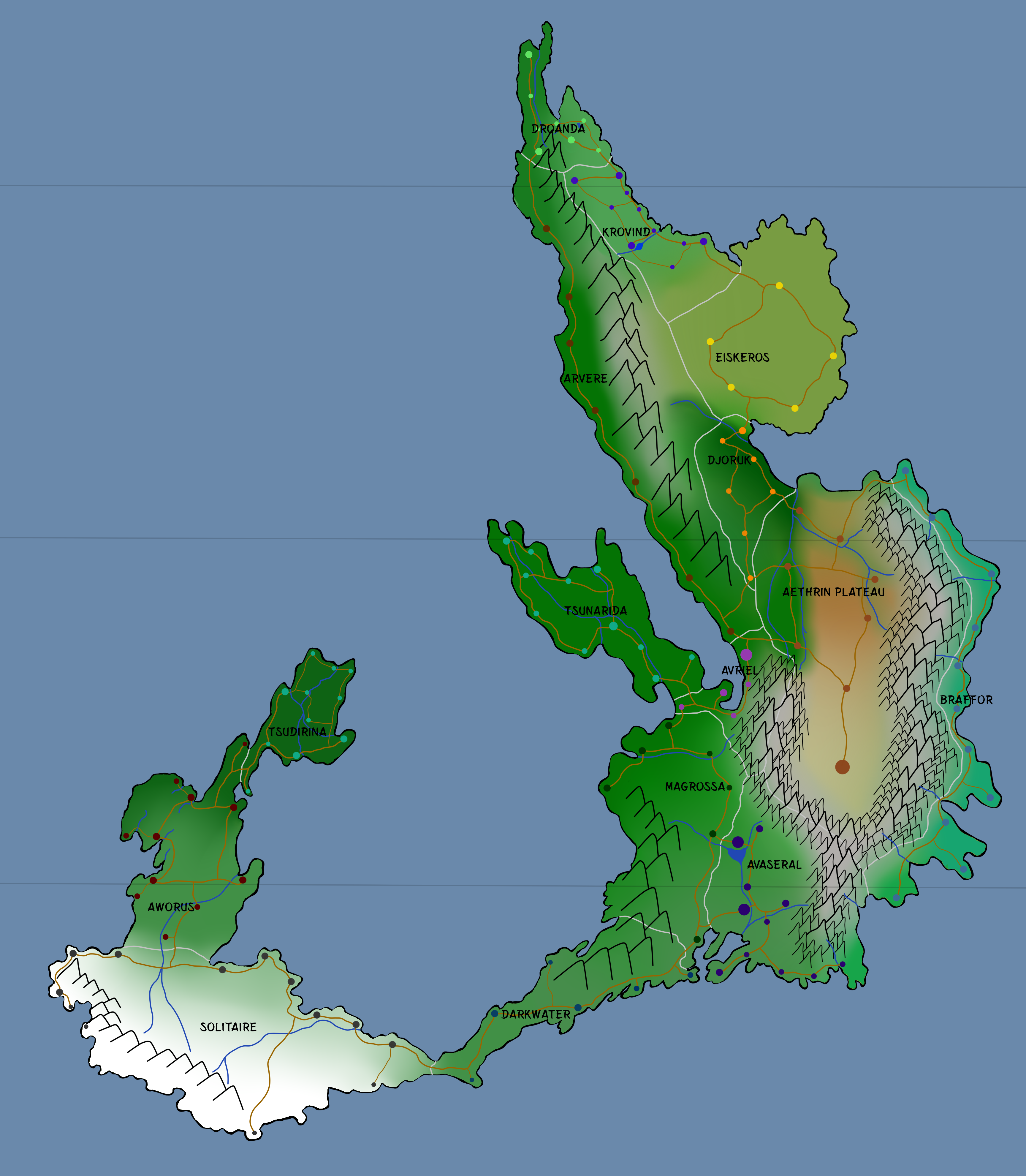 Populated by rodentfolk, and at the northernmost tip of the continent, Droanda is perhaps not-so-surprisingly heavily populated in the third age. The temperatures here stays mild, although storms are frequent and the low hills are prone to flooding. This makes the land fertile for farming, and the five major are surrounded by countless farms. Droandans hold the the Cataclysm and the ensuing appearance of magic