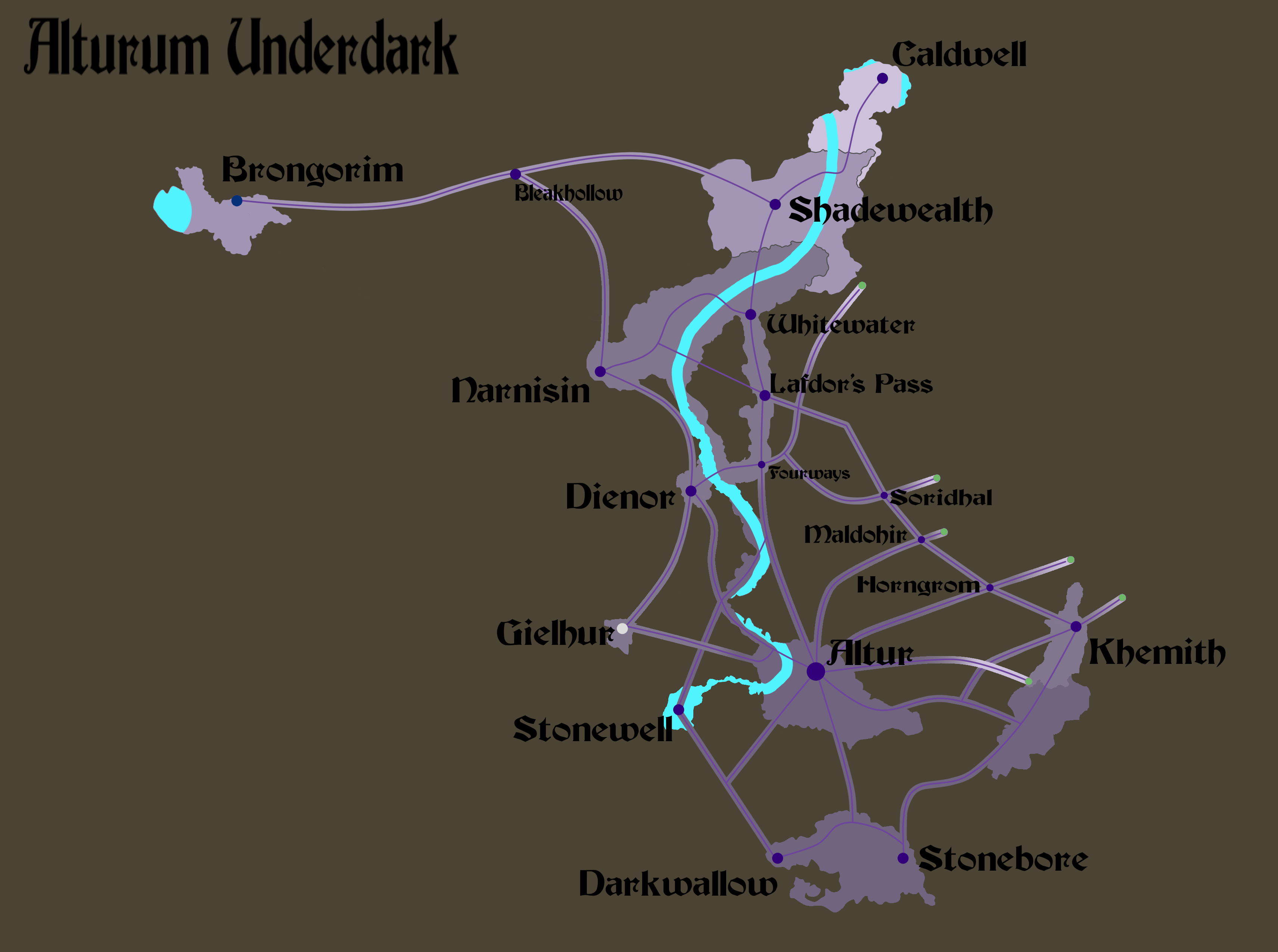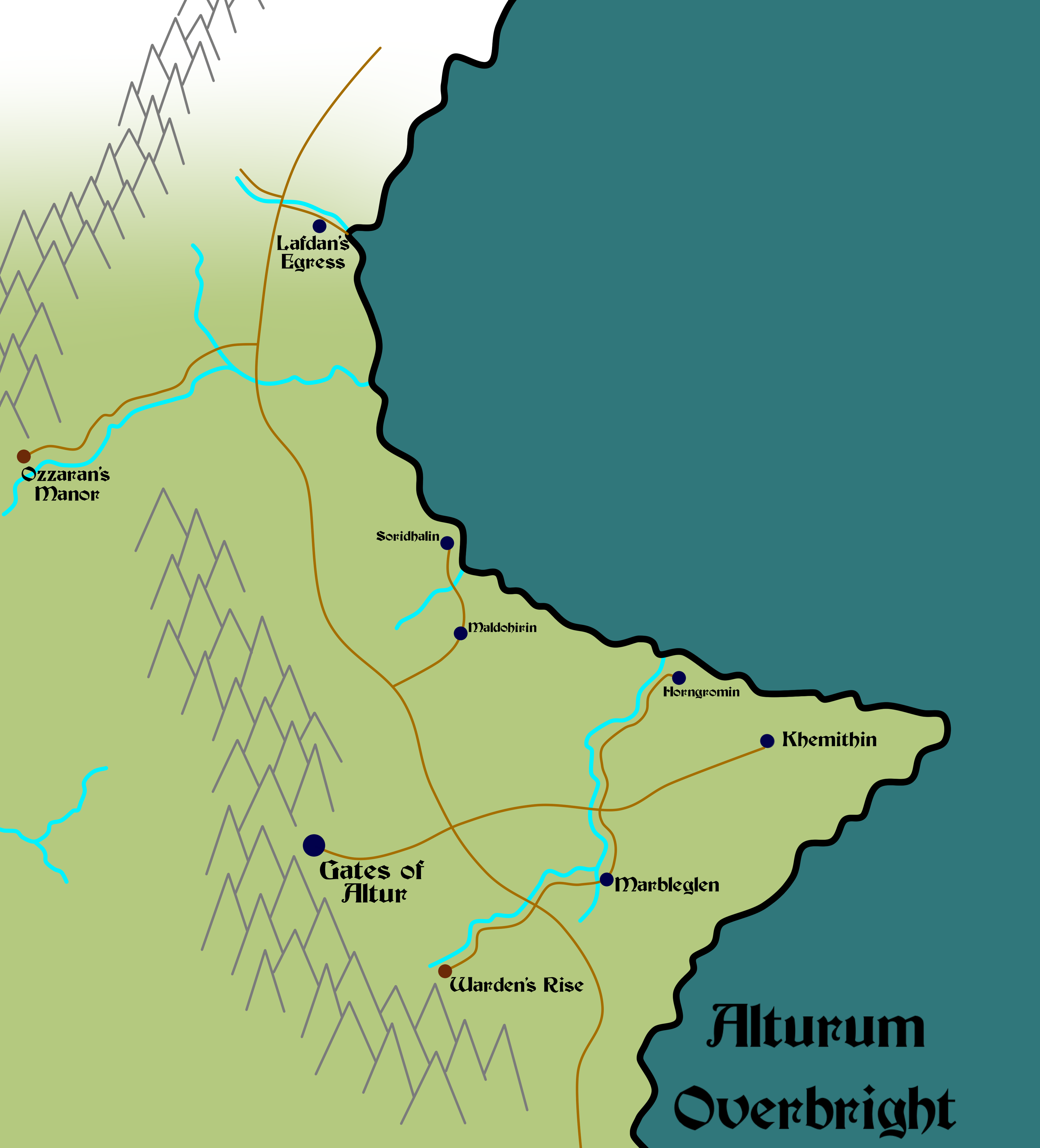 Deceptively small on the surface, the Alturum Empire actually spans the entire length of the Vaces Mountains, in a labyrinth of underground tunnels and cave system. The majority of the Alturum population is thus extremely well adapted to living underground, where the sun holds little sway. Outsiders often find the Alturum Depths to be a strange and uncomfortable place, and any travellers guide will repeatedly warn you to be careful when journeying in the depths. Even you don’t encounter any of the dangerous creatures that have adapted to the darkness, you may find yourself simply lost among the maze of tunnels dug over the many centuries since the Cataclysm.