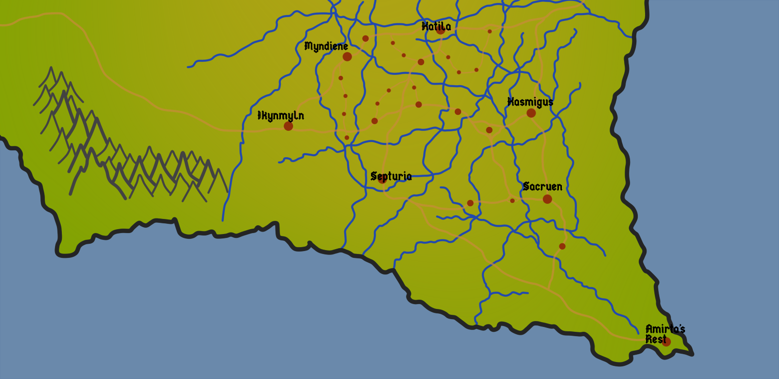 Divided up by a web of deep river valleys, the highlands of the Causeway have historically been a difficult to traverse place that resisted a more typical governmental structure. The region has a relatively peaceful history, although in the time since the Cataclysm, a great number of deadly creatures have come to roost in the riverside cliffs. Six major cities have developed across the region and function as regional centers of commerce. In the modern day, these City-States have a loose alliance with each other, and work together to maintain the trade routes between themselves and their bordering countries.